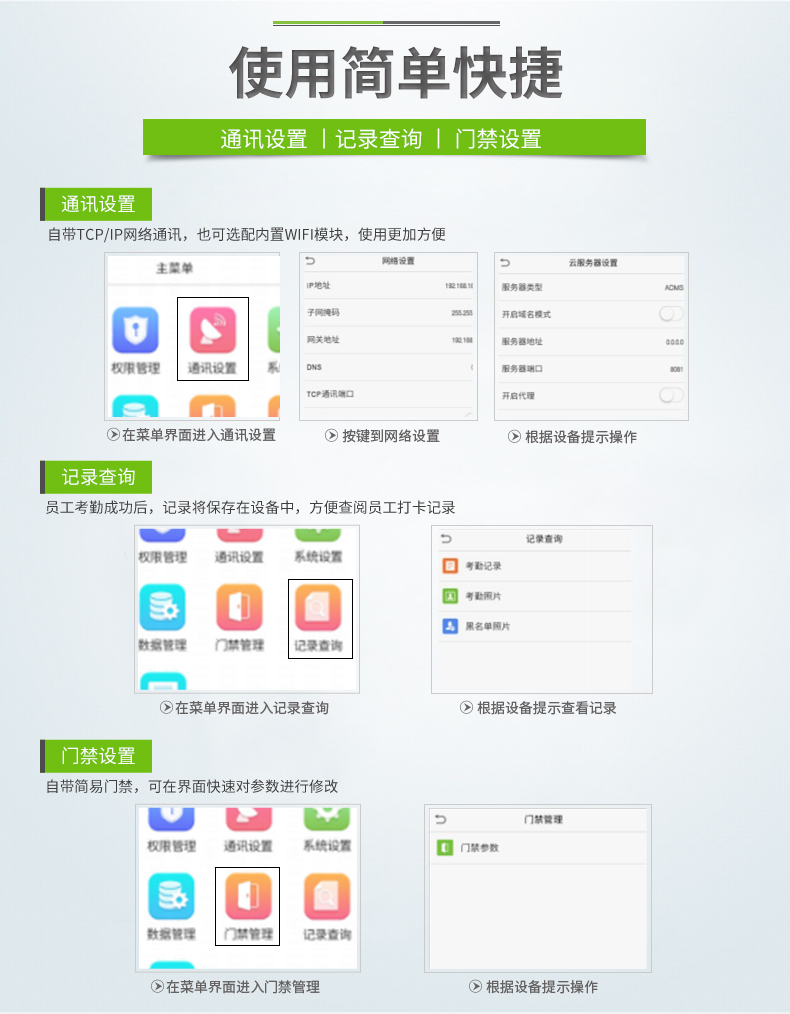 基礎功能 記錄查詢、Photo ID、門磁、報警、出門開關